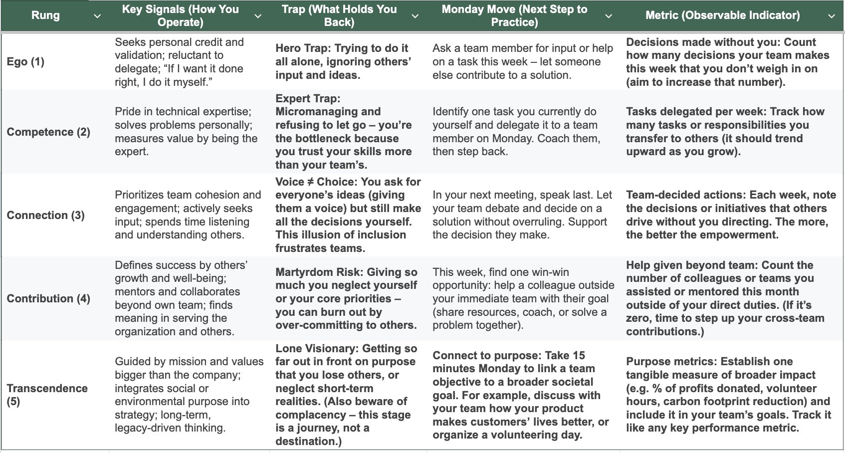 Team Diagnostic: You can apply the Growth Ladder lens to your whole team or organization, too. Here are simple metrics at three levels:- Individual Contributors: Collaboration Index – e.g., how many cross-team or peer-to-peer assists has each person made this quarter? (A higher number suggests growth beyond ego and competence.)- Managers: Delegation Rate – what percentage of key decisions or tasks do managers delegate to their team versus doing themselves? (Healthy management at Connection and Contribution levels will delegate more as teams develop.)- Executives: Purpose Alignment – track one metric of societal or long-term impact (customer NPS, community investment, innovation for future growth) in your strategic scorecard. Are top leaders accountable for something beyond quarterly profits?